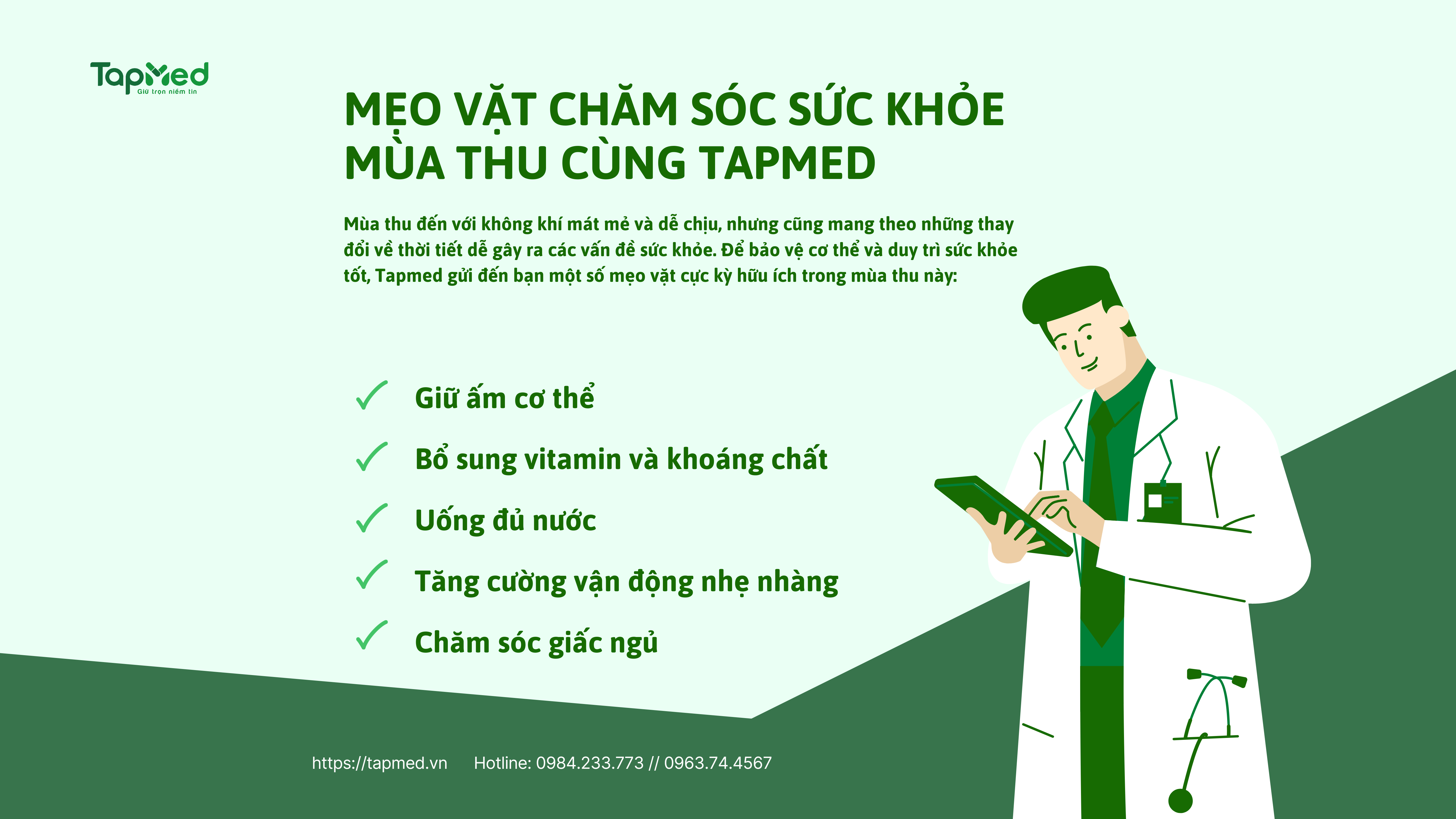 Mùa thu là thời điểm chuyển giao giữa cái nóng oi bức của mùa hè và cái lạnh se se của mùa đông. Đây cũng là thời điểm mà cơ thể chúng ta cần được chăm sóc đặc biệt để duy trì sức khỏe và năng lượng. Dưới đây là một số mẹo vặt giúp bạn chăm sóc sức khỏe mùa thu hiệu quả cùng Tapmed.